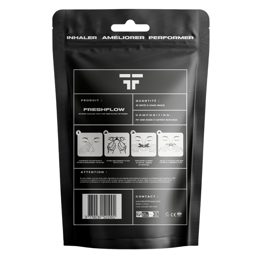 Repoussez vos limites avec les bandes nasalesFreshFlow noires, les bandes nasales pensées pour les sportifs exigeants.
