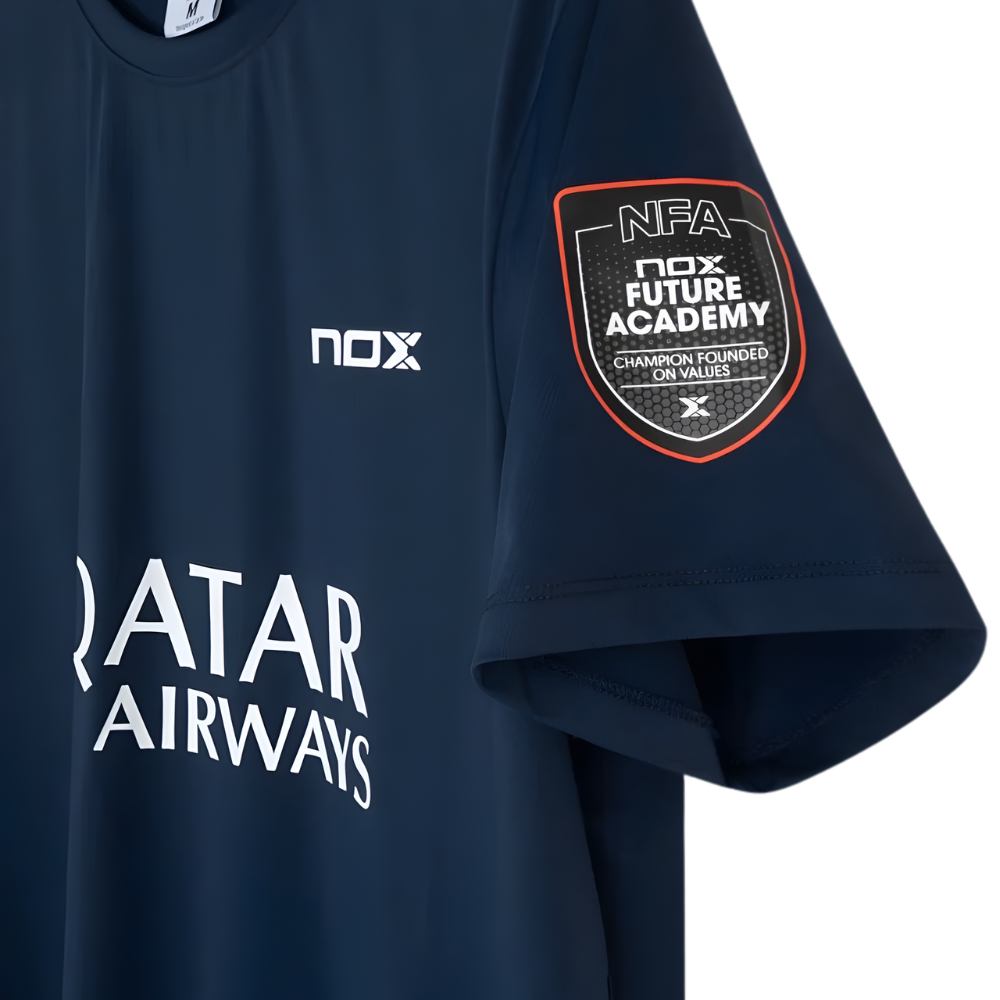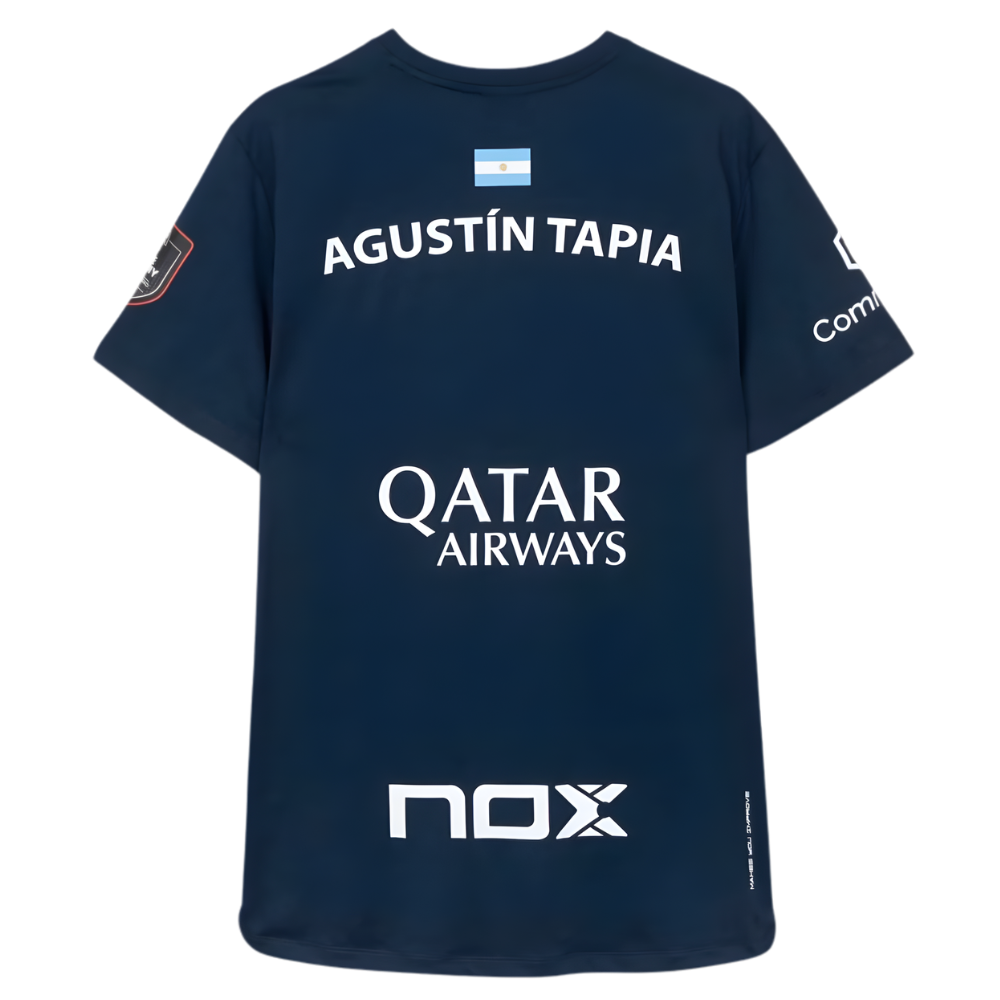 Nox est heureux de vous présenter le t-shirt Nox Replica Agustín Tapia AT10 Bleu Marine 2026, la réplique officielle du maillot porté par le célèbre joueur de padel.