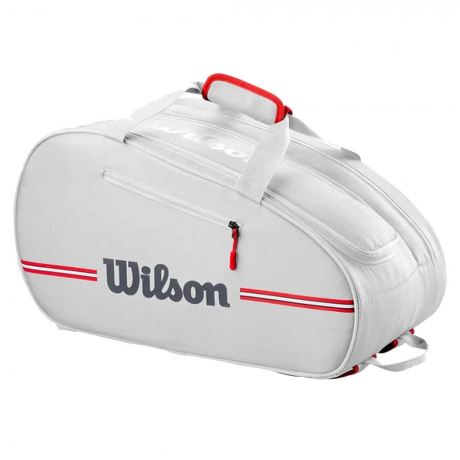 Principalement blanc, ce sac arbore des touches de rouge subtilement nuancées, ainsi que le logo emblématique de Wilson en lettres fines au centre.