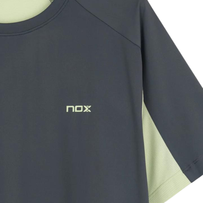 Ce t-shirt arbore un design élégant en gris, agrémenté de subtils détails verts sur les manches et le dos, ainsi que du logo NOX sur la poitrine.