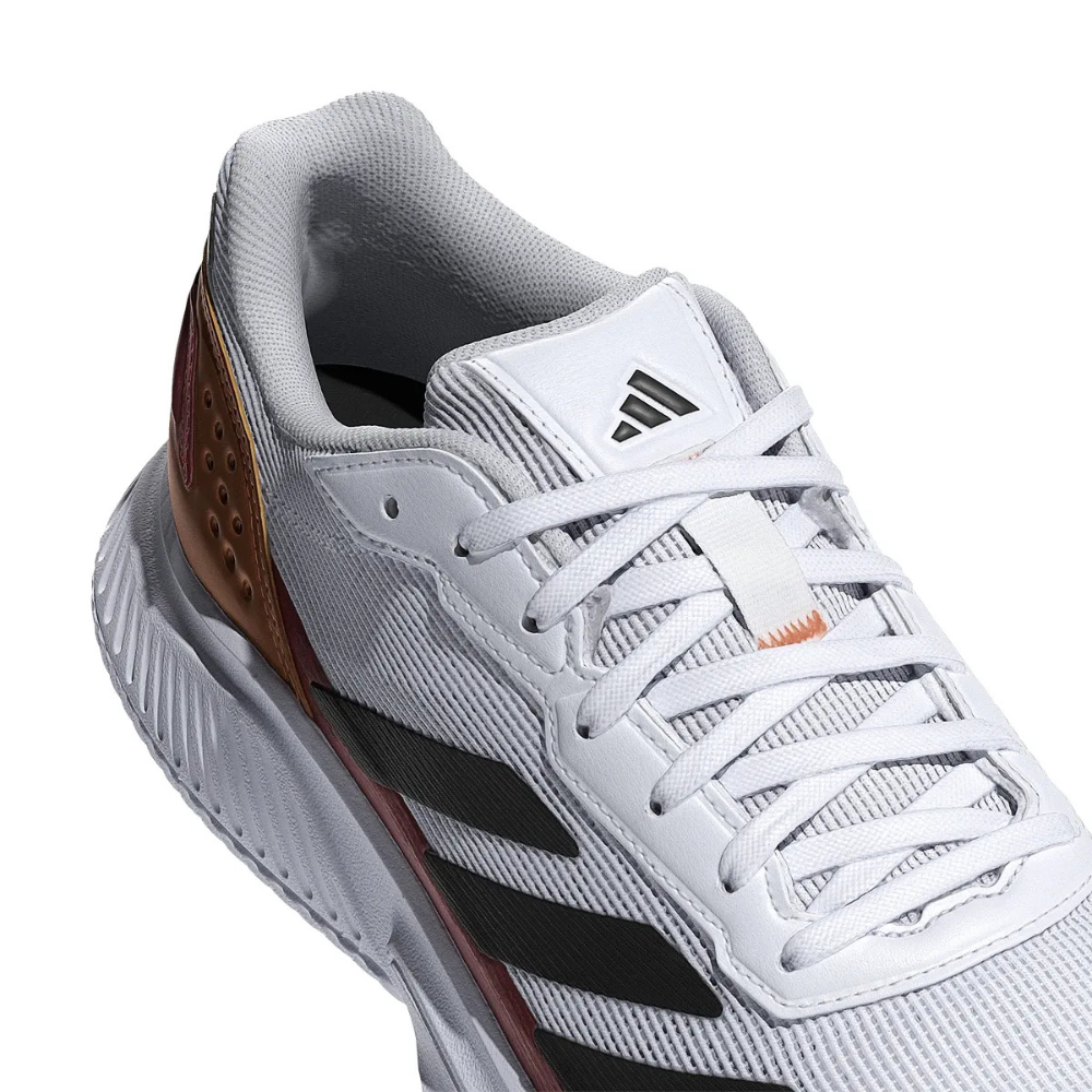 Adidas présente les chaussures de padel Court Quick Blanc/Orange, un modèle alliant élégance, stabilité et performance.