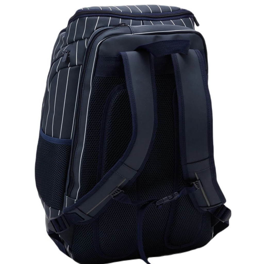 Son design raffiné associe un bleu marine profond à de discrètes rayures blanches, rehaussé par le logo emblématique de la marque, pour un style à la fois moderne et professionnel.