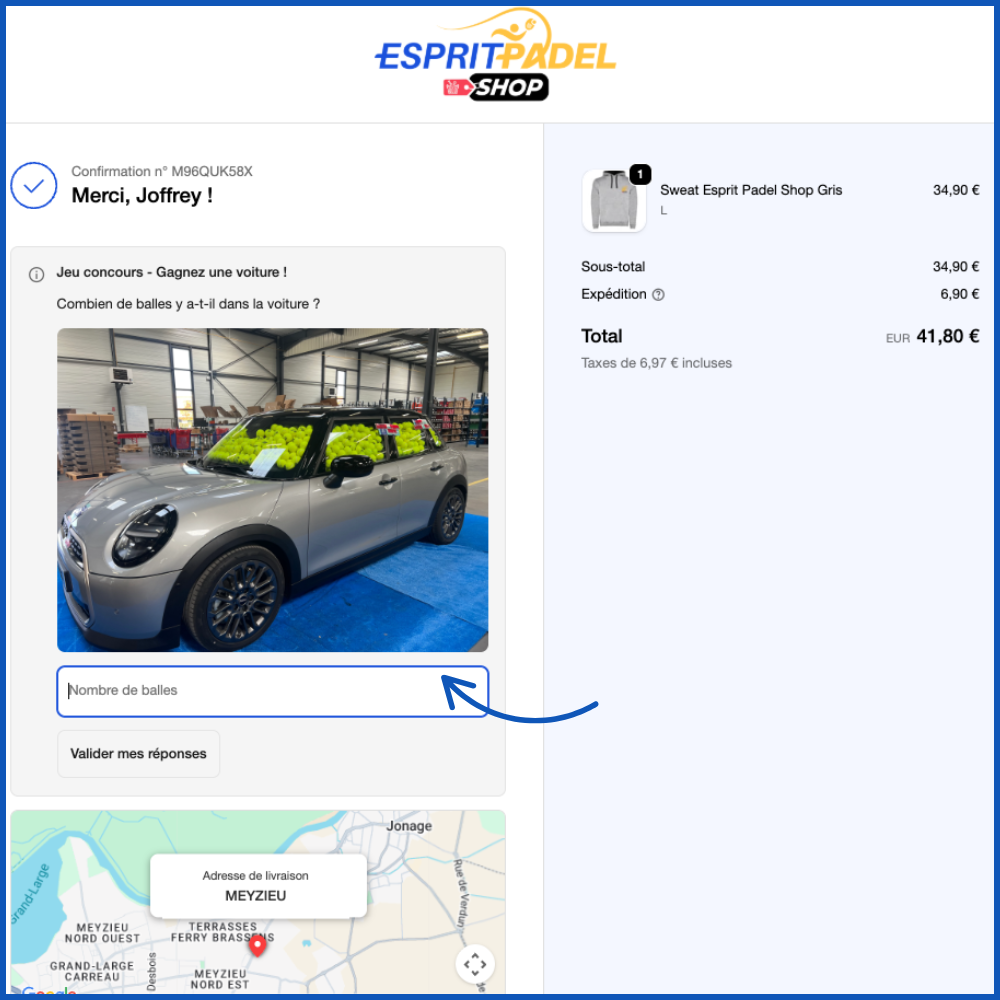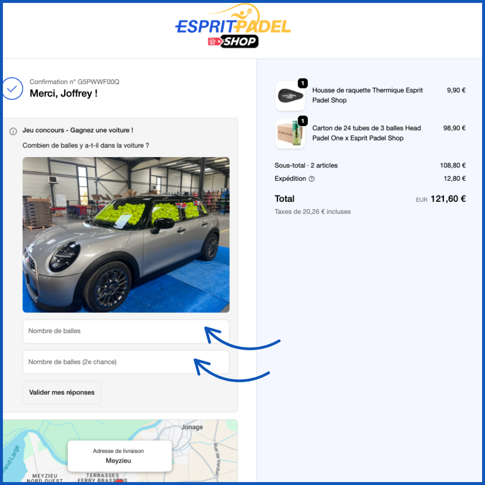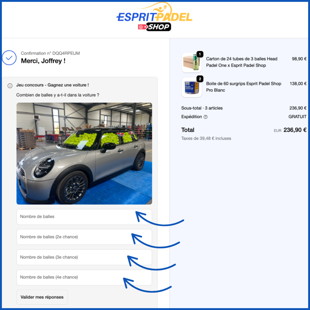 Principe du jeu : Après validation de ta commande, tu te retrouveras sur la page de remerciement et tu devras estimer le nombre exact de balles de padel présentes dans la voiture.