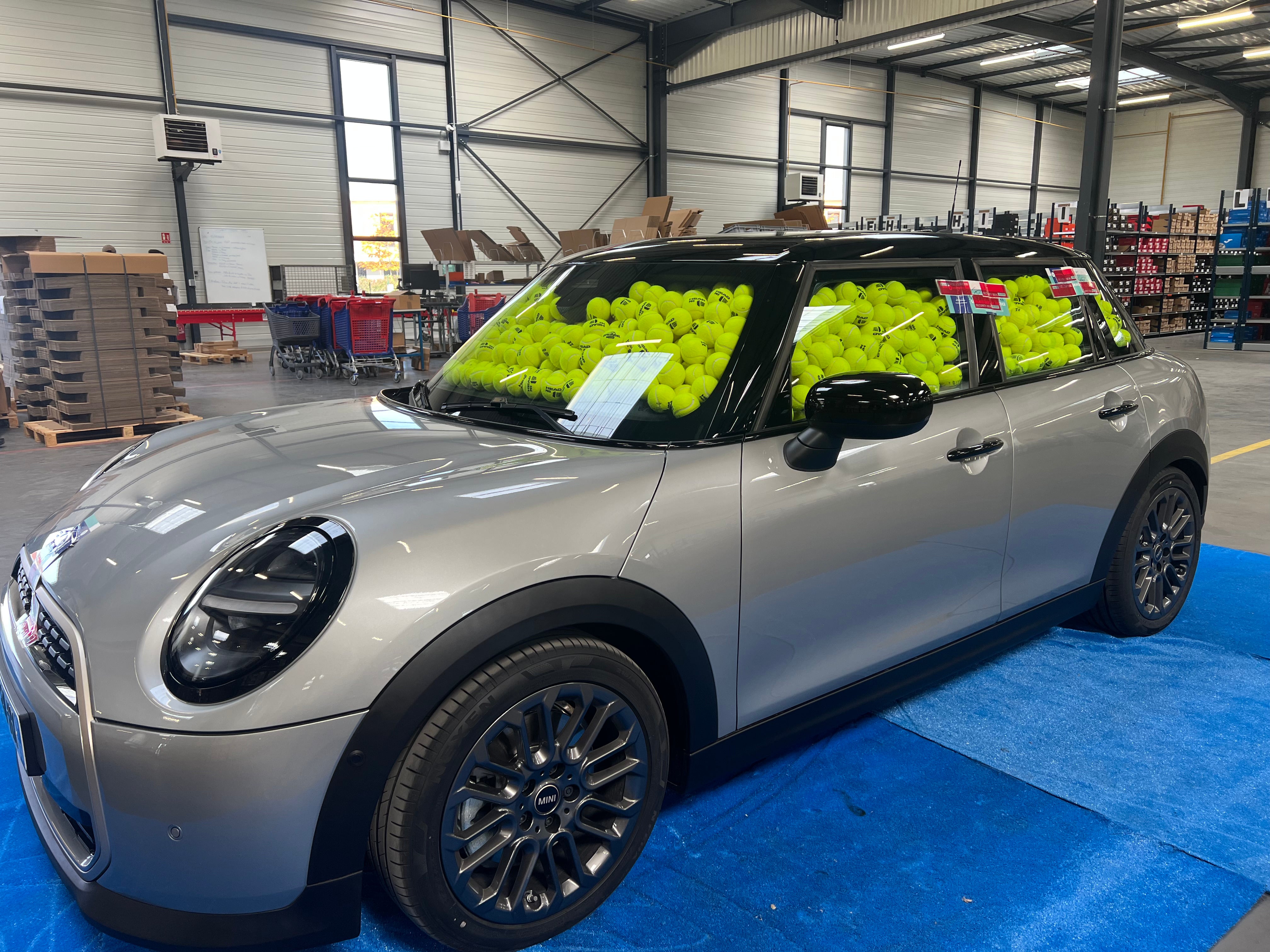 La voiture est principalement remplie de balles de padel HEAD d’aspect neuf. Celles-ci n’auraient, dans tous les cas, pas pu être utilisées pour jouer au padel. On y trouve également quelques balles usagées provenant de notre partenaire Bounce.