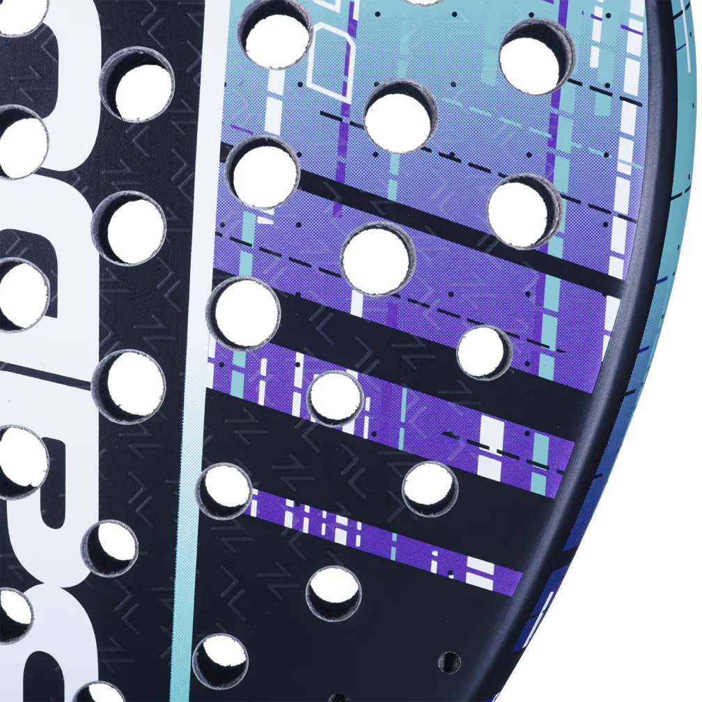 Distribuição e tamanho dos orifícios otimizados para cada forma de raquete para melhorar a transmissão de energia e a precisão dos golpes no momento da greve.